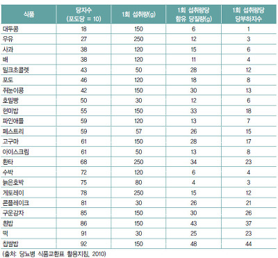 아래 표의 출처는 당뇨병 식품교환표 활용지침, 2010 입니다.